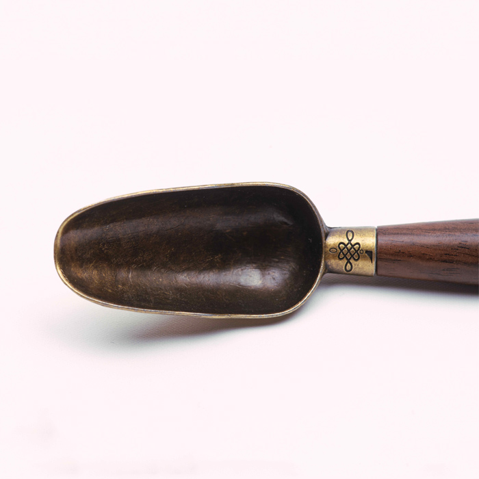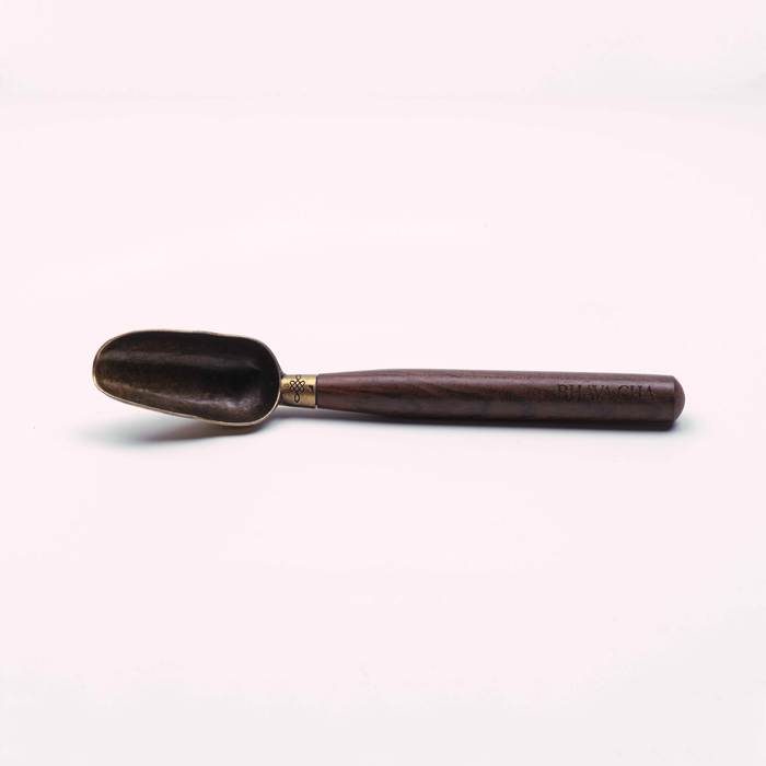 This Bhava Cha tea spoon features a polished brass scoop paired with a smooth, dark wooden handle. Designed for intentional brewing, the brass scoop measures approximately 2 grams -the ideal portion for a single serving of loose-leaf tea.