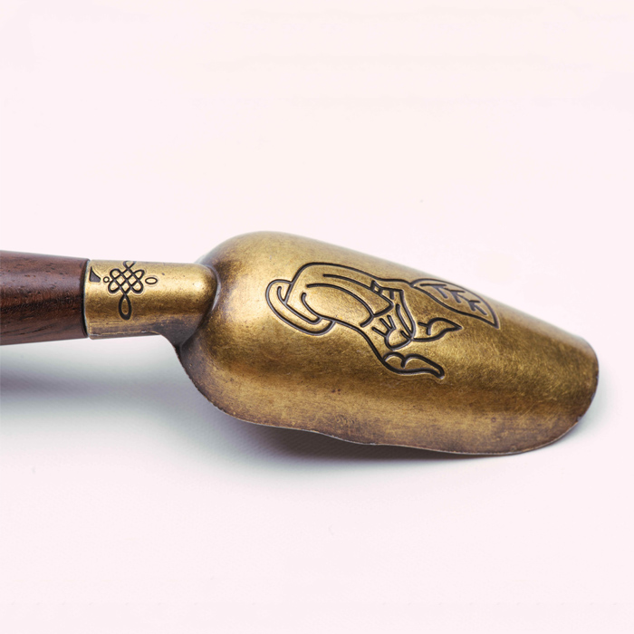 - Solid brass scoop with wooden handle