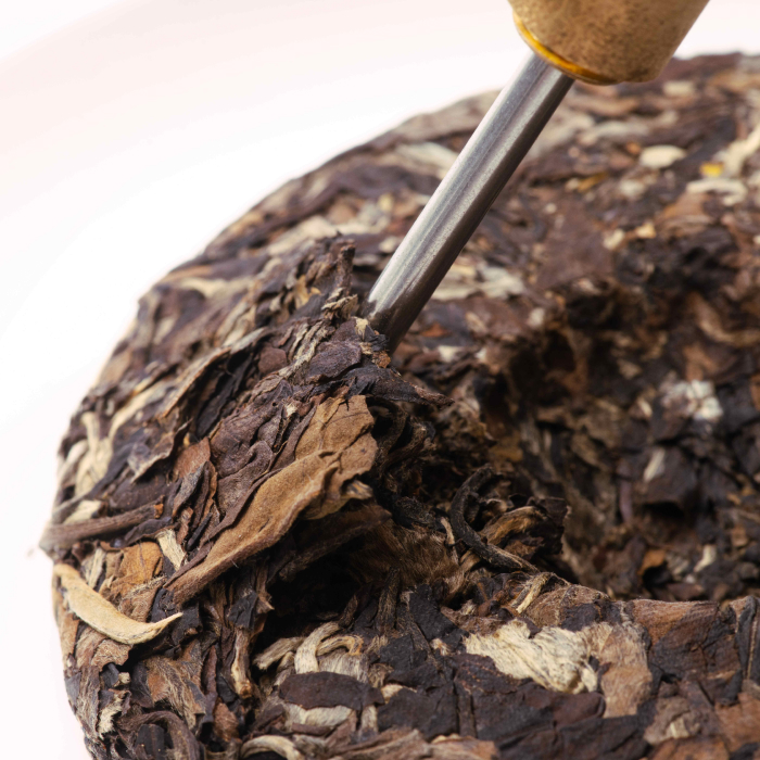 Steady the compressed tea with one hand and gently insert the needle into the edge or seam with the other. Apply light pressure and a subtle wriggling motion until the tea loosens and releases. Always keep the blade angled away from your body and free hand. Compressed teas form laminated layers, and this design works with that structure—not against it.